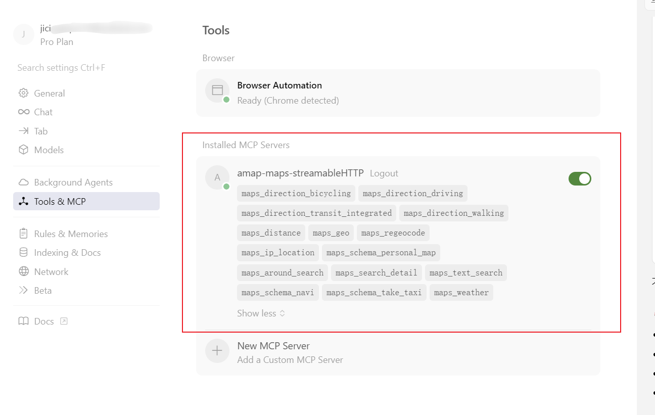 MCP配置完成后,可在Cursor后台确认MCP服务状态,确保服务已正常启动。