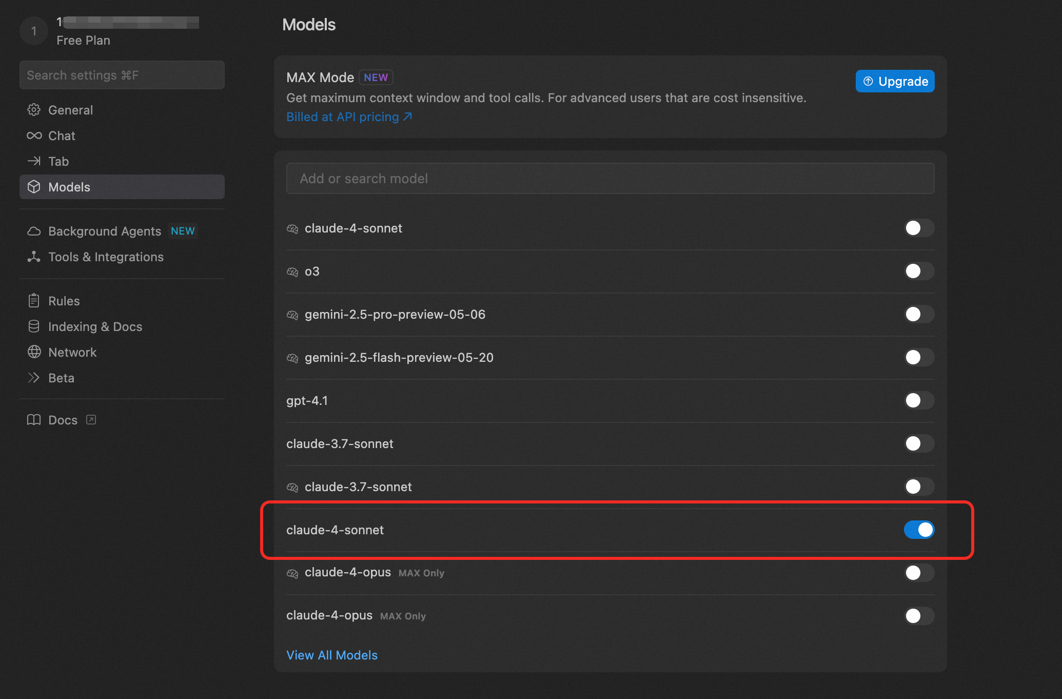 1.4 选择配置 Cursor 大模型让你拥有更好的服务体验,建议选择 claude-4-sonnet