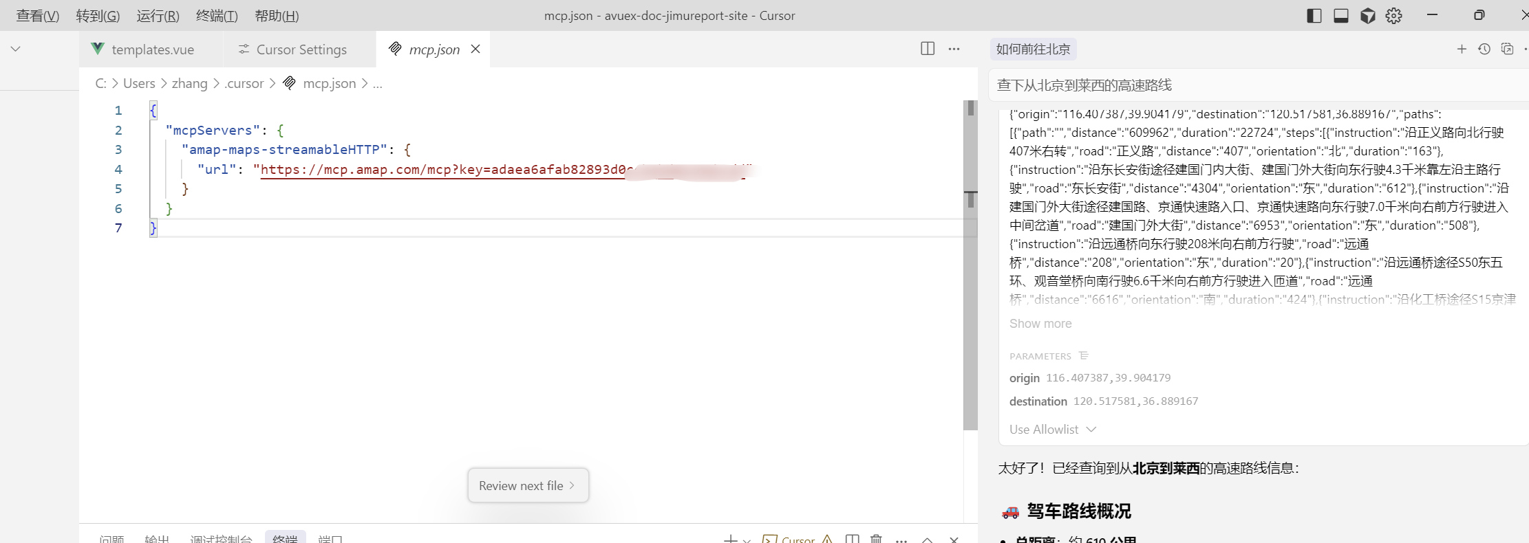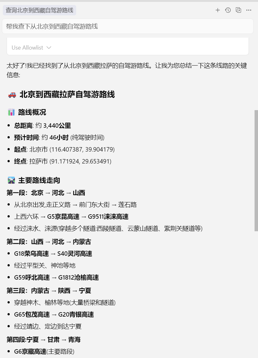 配置成功后,我尝试向Cursor输入路线查询相关问题,系统自动调用高德MCP进行处理。