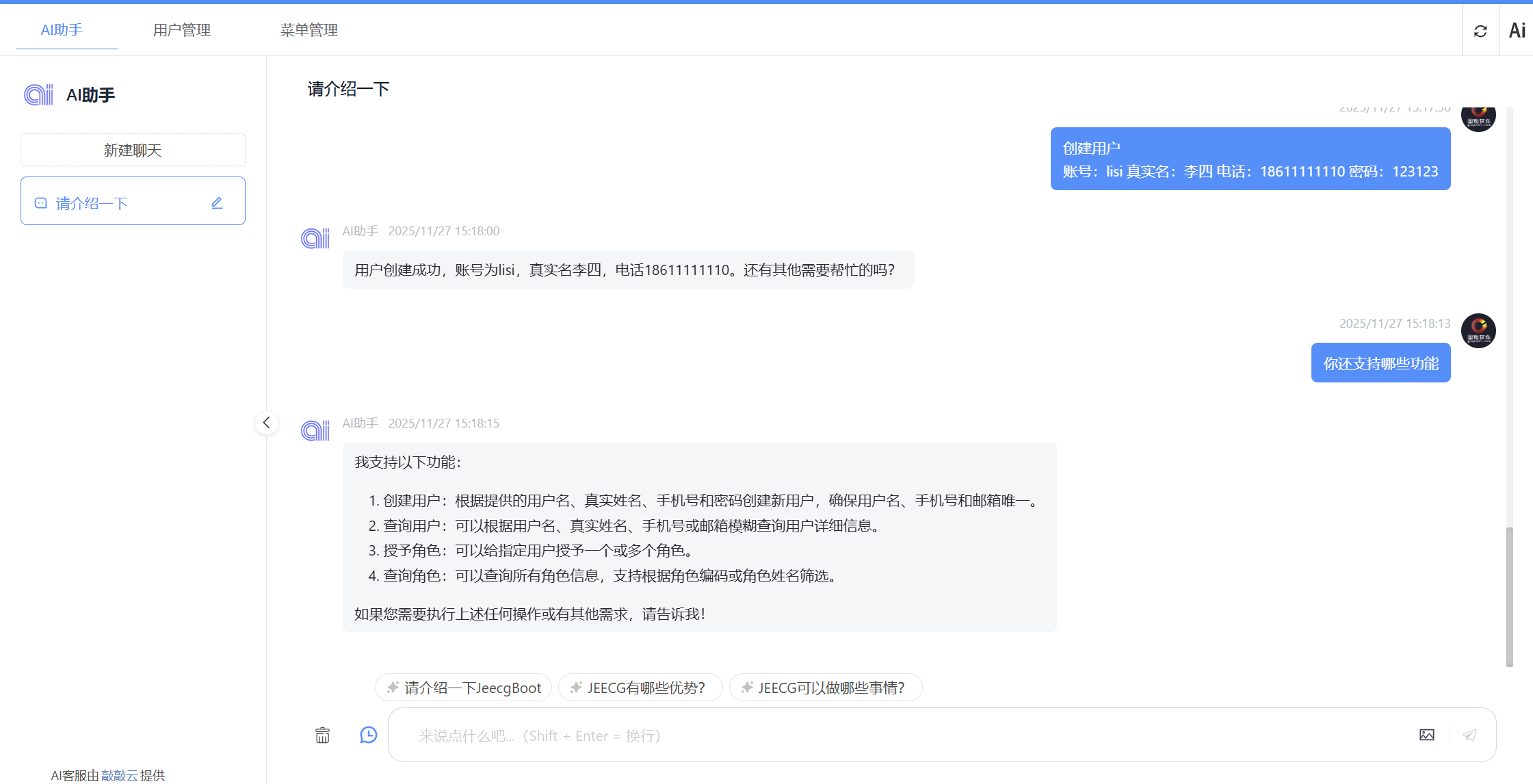 在JeecgBoot自带的AI聊天窗口,直接发送以下内容,系统将自动创建用户: