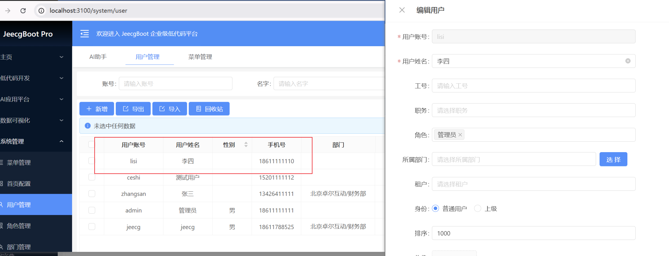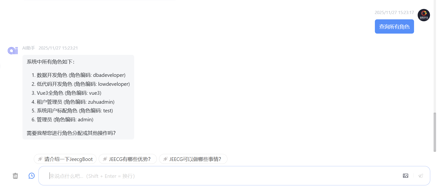 请确保系统已升级至 v3.9.0 及以上版本,并完成 AI 账号的配置与相关设置。自 v3.9.0 起,Jeecg 已内置聊天对接业务功能,支持通过自然语言实现用户创建、角色分配等操作。