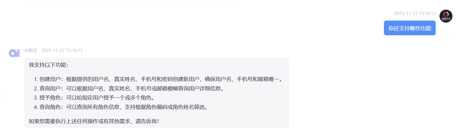 AI会返回当前支持的功能列表,方便你快速了解和使用: