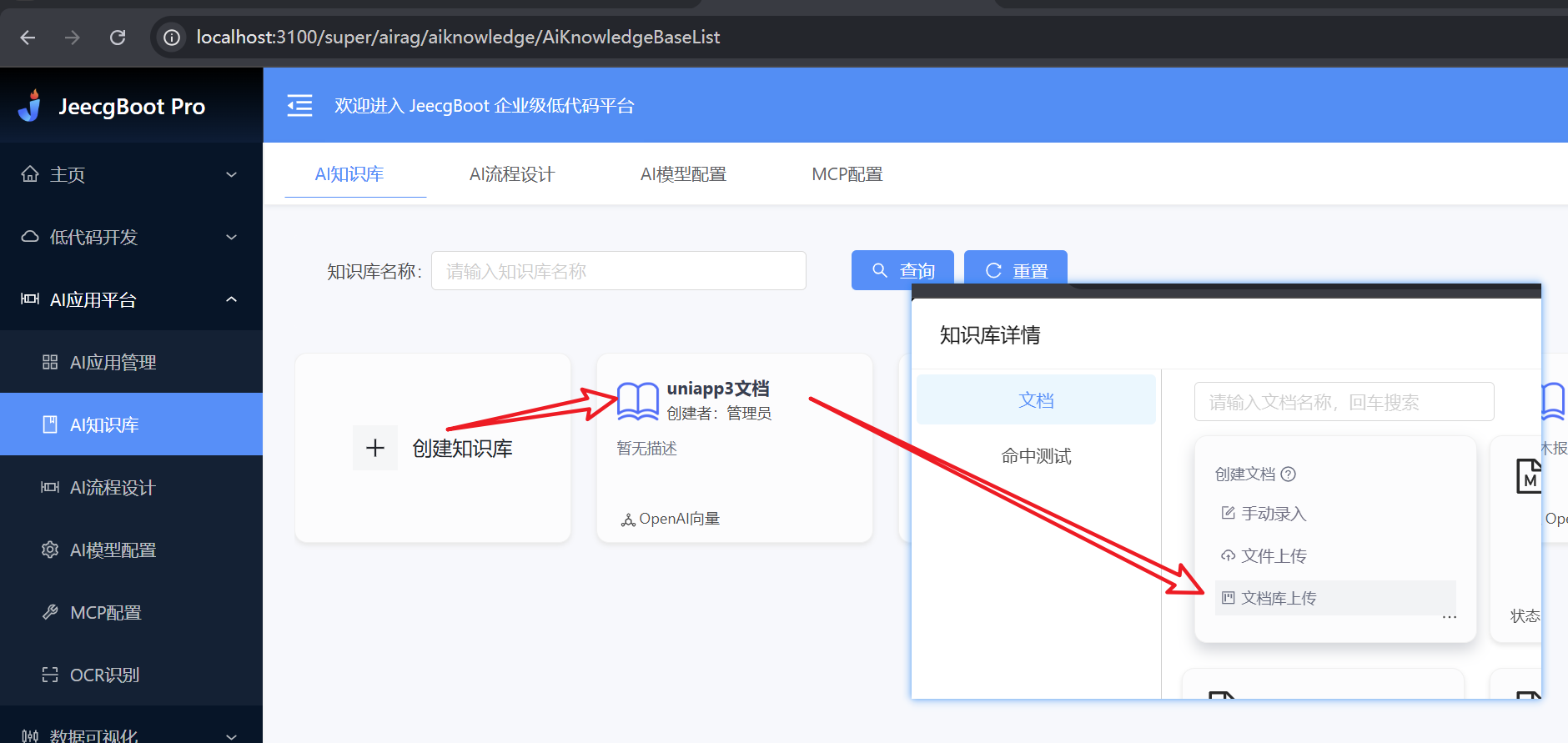 JeecgBoot AI智能聊天助手基于JeecgBoot平台的AI知识库构建,支持Markdown文档的自动化处理与知识提取,帮助快速搭建智能文档助手。本文档详细介绍如何制作和上传AI知识库包。