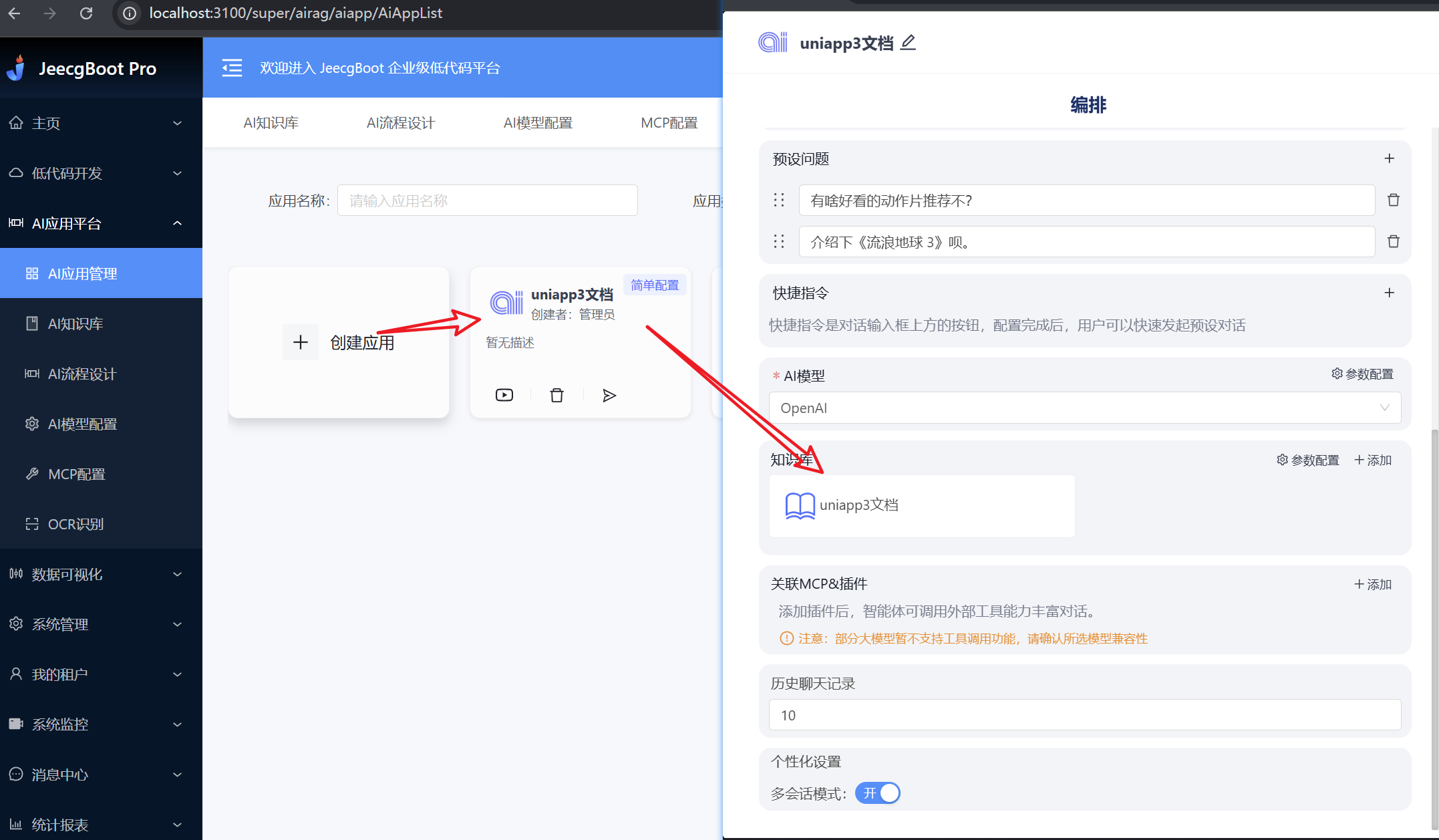 关联刚上传的AI知识库,实现智能问答和文档检索功能: