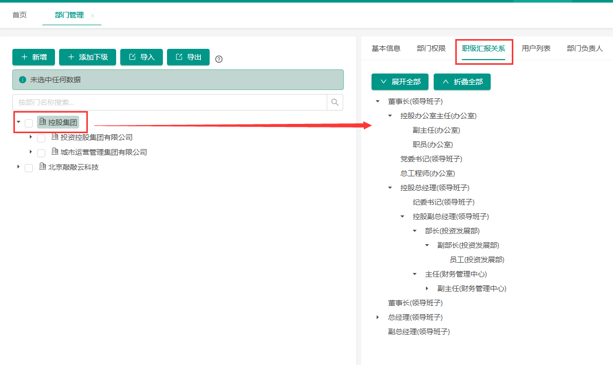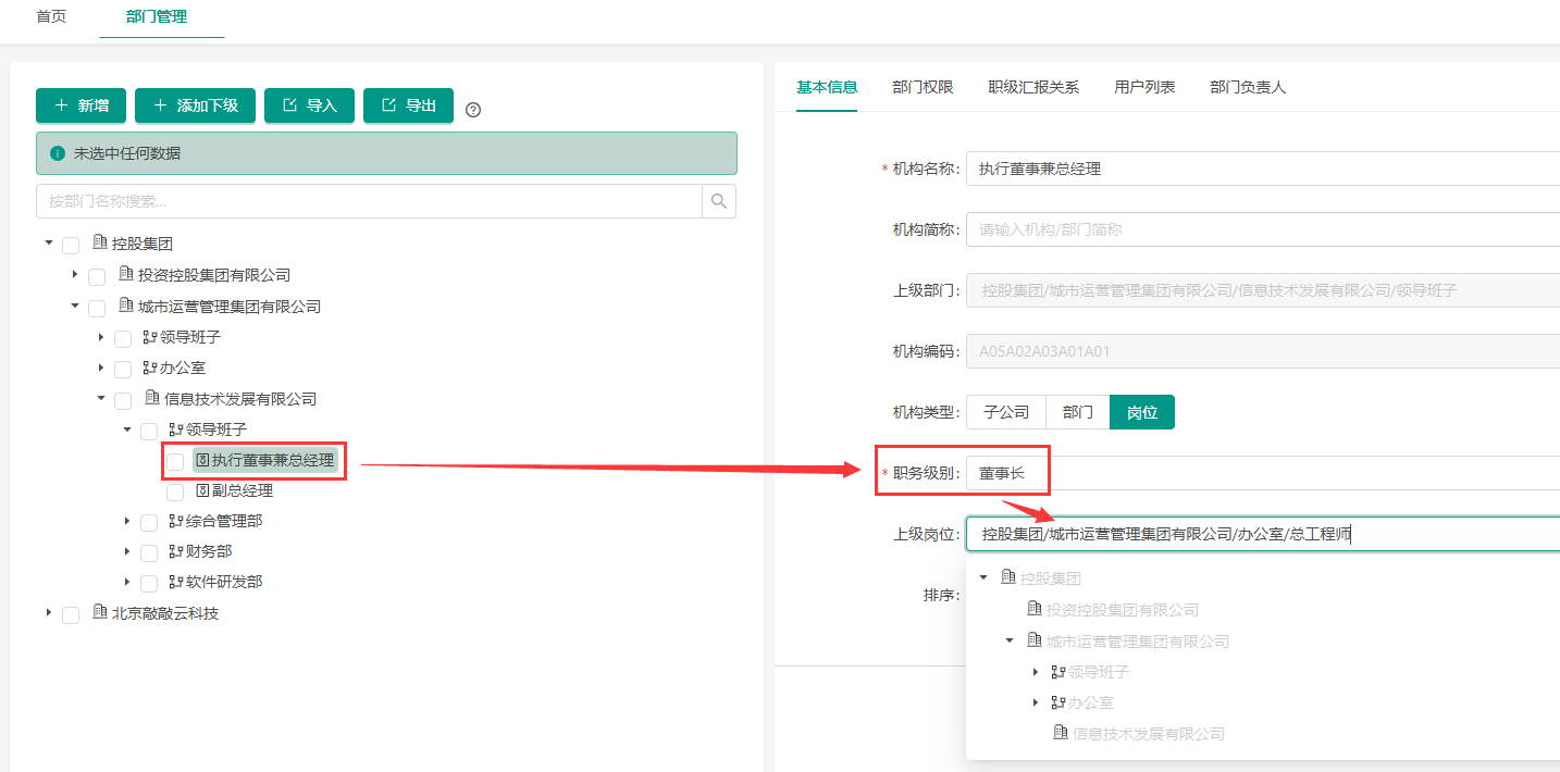 - 董事长岗位:仅可选择上级公司(子公司或总公司)各部门岗位为上级