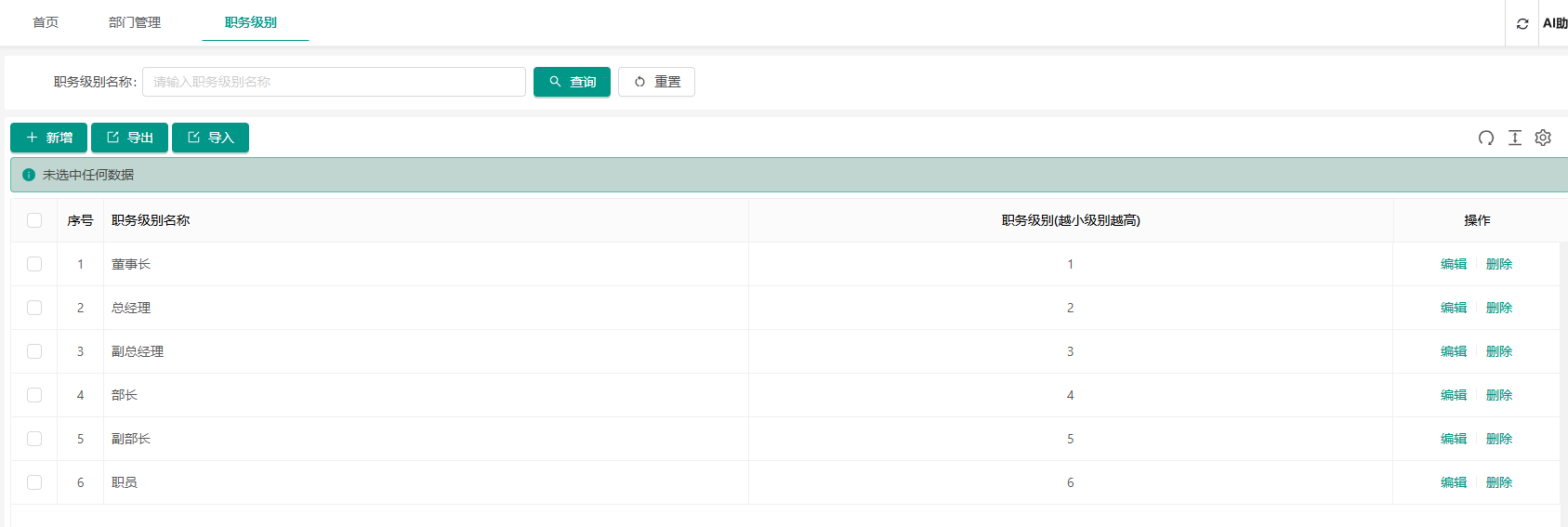 - 职级上下贯通:董事长 → 总/副总 → 部长/副部长 → 职员,清晰可维护。