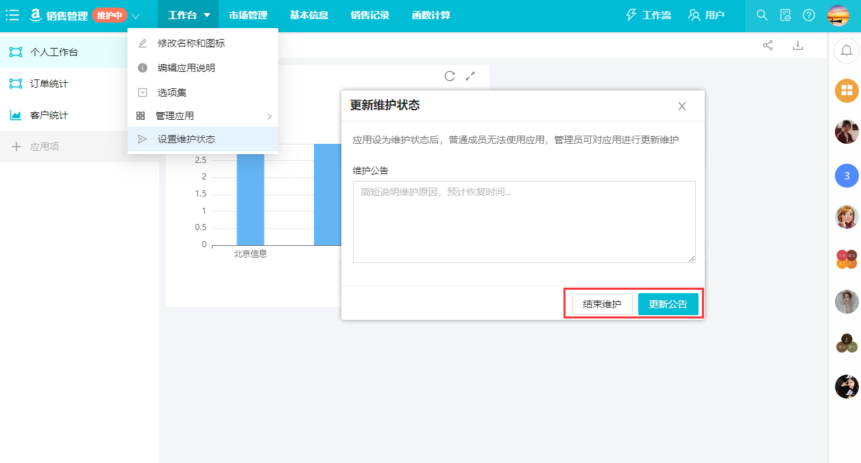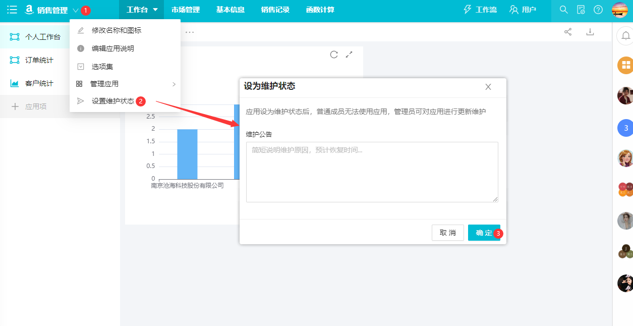 - 进入应用后,点击向下的三角(①),在下拉菜单中点击设置维护状态(②),出现弹窗,填写维护公告,点击确定按钮完成对该应用的维护操作