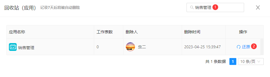 - ①输入应用名称查询应用。②点击可以对应用进行还原。回收站只能保存 7 天的记录,如果超过 7 天会自动彻底删除,自动删除的应用无法还原