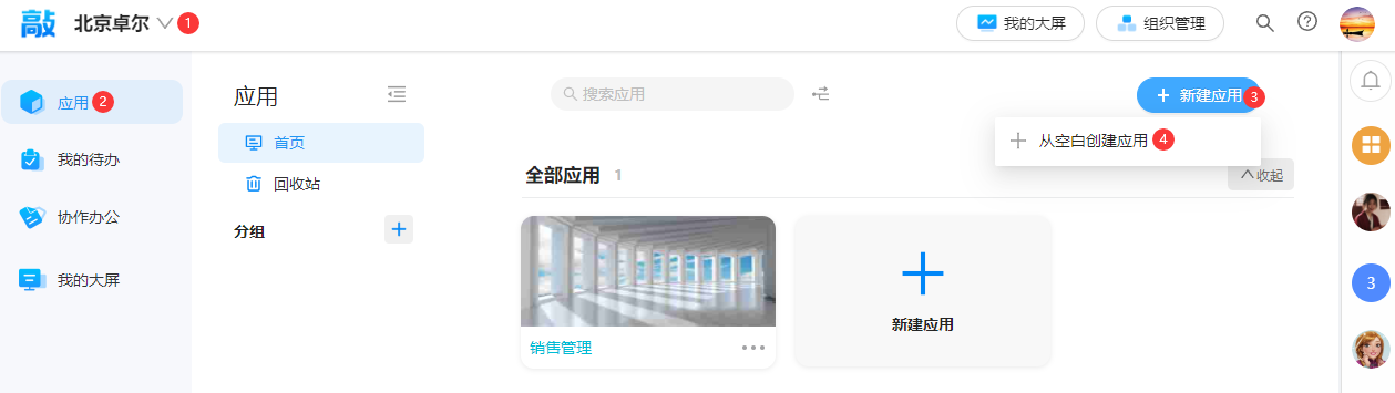 - 第二种方式:选择需要新建应用的组织,点击左侧的应用,然后点击新建应用按钮,在下拉菜单中点击从空白创建应用