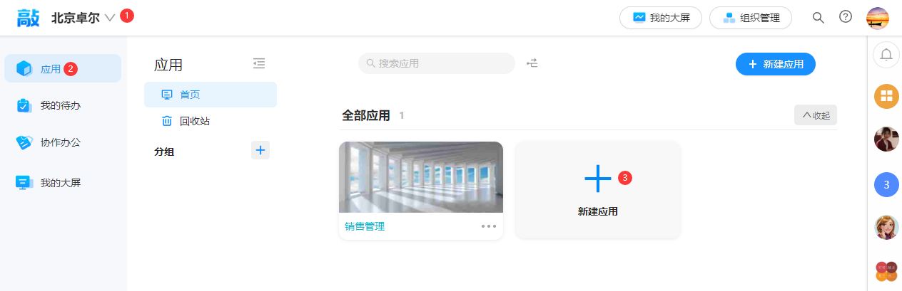- 第一种方式:选择需要新建应用的组织,点击左侧的应用,然后点击新建应用