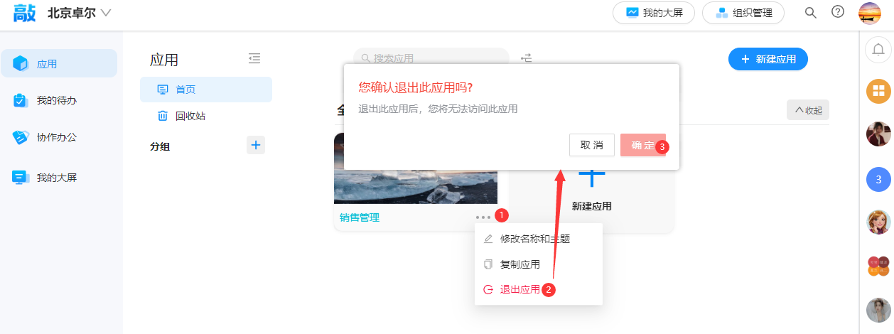 ...,鼠标移动在下拉菜单中点击退出应用,会出现退出应用的弹窗,点击确定完成退出应用