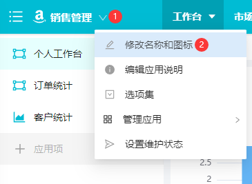 - 二是进入应用后,点击左上方的向下的三角,点击找到修改名称和图标