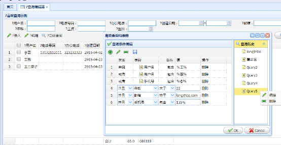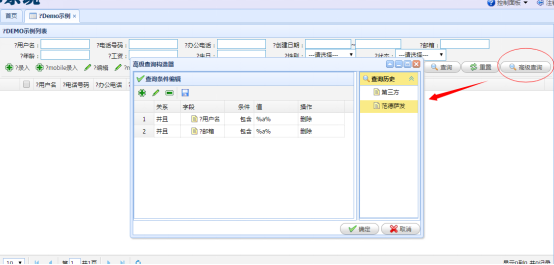 右侧有查询历史,将每次查询的json条件保存在一个数组中实现快速重查,这个历史查询记录使用HTML5的localstorage保存在客户端缓存中,下次登录仍然有效,对于不支持localstorage的浏览器将使用cookie存储。