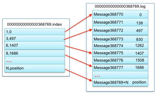 其中以索引文件中元数据3,497为例,依次在数据文件中表示第3个message(在全局partiton表示第368772个message),以及该消息的物理偏移地址为497。