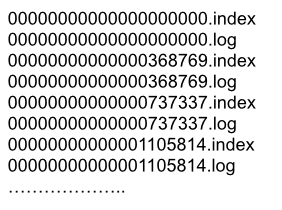 Segment文件命名规则:Partion全局的第一个Segment从0开始,后续每个Segment文件名为上一个Segment文件最后一条消息的Offset值。数值最大为64位long大小,19位数字字符长度,没有数字用0填充。