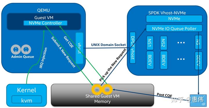 qemu模拟nvme,把nvme内存共享级SPDK进程,虚拟化组的SPDK轮询guest里driver的操作,作为nvme-of initiator把IO交给nvme-of target处理。