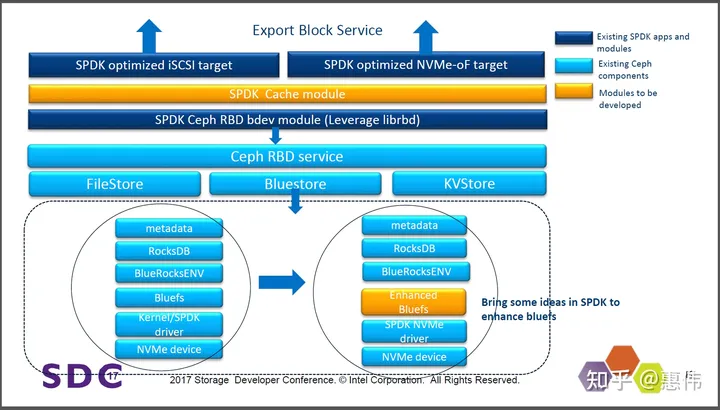 目前虚拟化对接的是ceph,新架构虚拟化对接SPDK,SPDK后面才是ceph,这种架构和裸金属v2也统一,裸金属v2用了iscsi,新架构用nvme,裸金属v2 iscsi initiator运行在裸金属中,iscsi target运行在存储组的SPDK iSCSI target server,IO增强型企业级实例nvme initiator运行在虚拟化组的SPDK中,nvme-over-rdma target运行在存储组的SPDK target server中。