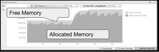 大多数情况下,功能代码都是由Dalvik虚拟机里执行的Java代码实现的,因此主要的内存消耗也是由Java代码使用new分配的内存。Android Device Monitor和Android Studio能够方便的观察Heap Alloc部分的大小,进行初步的统计,还能够观察到GC发生时的内存变化情况。