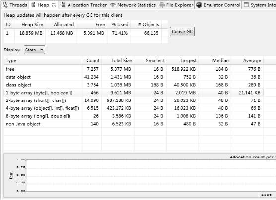 执行完成中,我们就可以根据数据进行比较初步的分析以确定方向。一方面是我们熟悉的Dalvik Heap部分,既由Java代码直接分配的内存,可以通过IDE直接观察到使用情况,也可以使用MAT进行细致的分析。