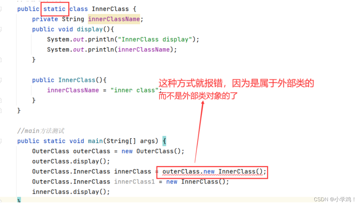 // InnerClass innerClass = new InnerClass(); //报错,不能跟之前一样