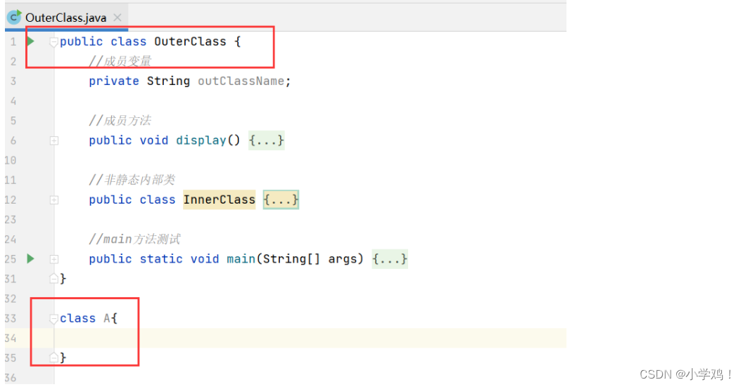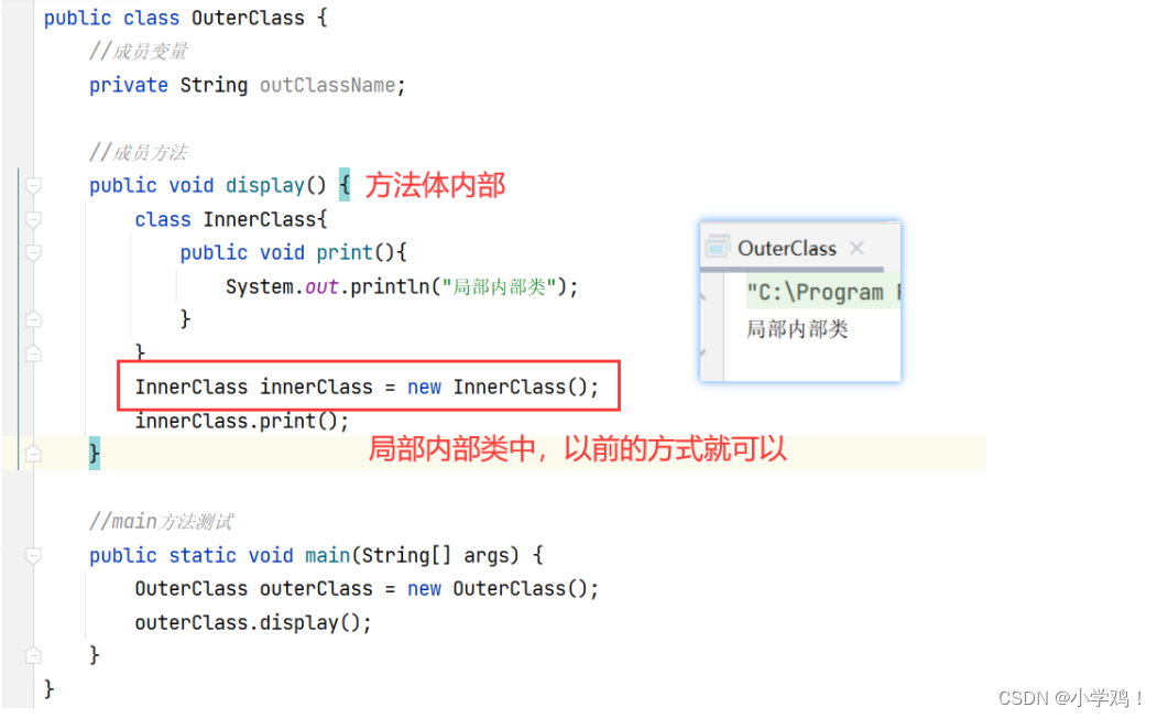 解析: OutClass 常称为 外部类,InnerClass 就是 OutClass 中的一个内部类,此时的内部类是一个非静态内部类。实例化的时候,外部类创建实例化对象还是一样,而内部类不一样。