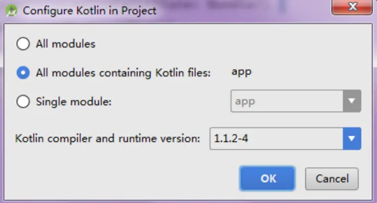 3、此时,我们仅仅是把java代码转换成了Kotlin语言而已。还不能编译因为此时的Kotlin还么有配置好,我们可以试着修改MainActivity中的代码,会有提示“Config”点击后会出现一个窗口,点击OK
