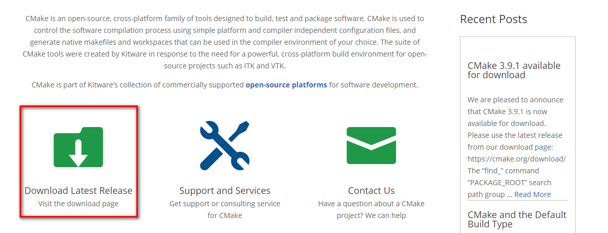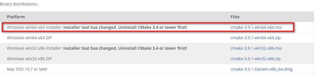 这里,我下载的是Win64的安装版本,可以免去设置环境变量的工作,下载解压版本需要在解压后再环境变量中设置Cmake的bin目录的地址