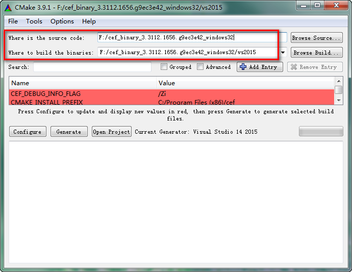 安装完成后打开CMake客户端在source code栏输入下载的cef源码下cmake文件的所在路径,在binaries栏输入自己希望构建生成sln的路径