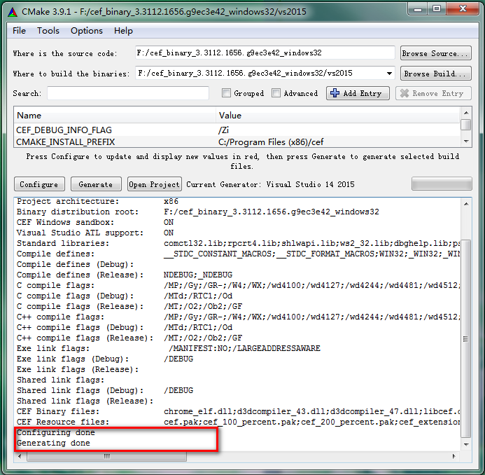 然后按configure按钮选择编译环境,在出现Configuring done后按Generate按钮,在Generating done之后就可以按Open Object打开刚才生成的项目文件进行编译了