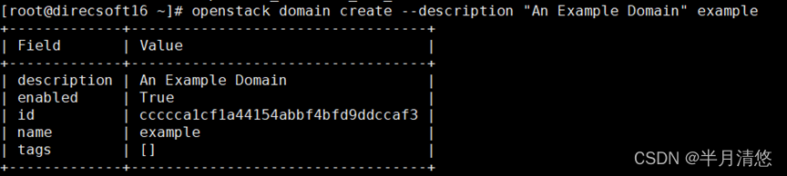 # openstack domain create --description "An Example Domain" example