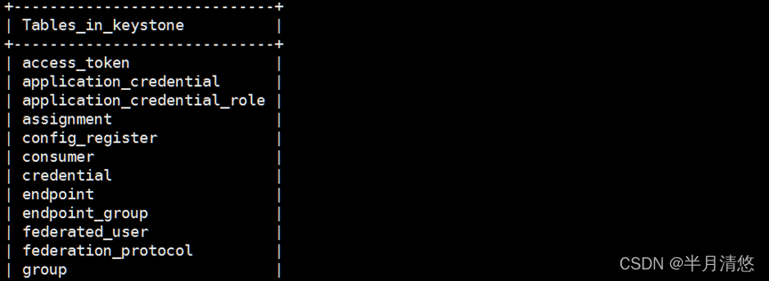 # mysql -ukeystone -pkeystone -e "use keystone;show tables;"