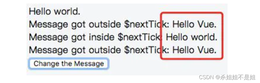从图中可以得知:msg1和msg3显示的内容还是变换之前的,而msg2显示的内容是变换之后的。其根本原因是因为Vue中DOM更新是异步的(详细解释在后面)。
