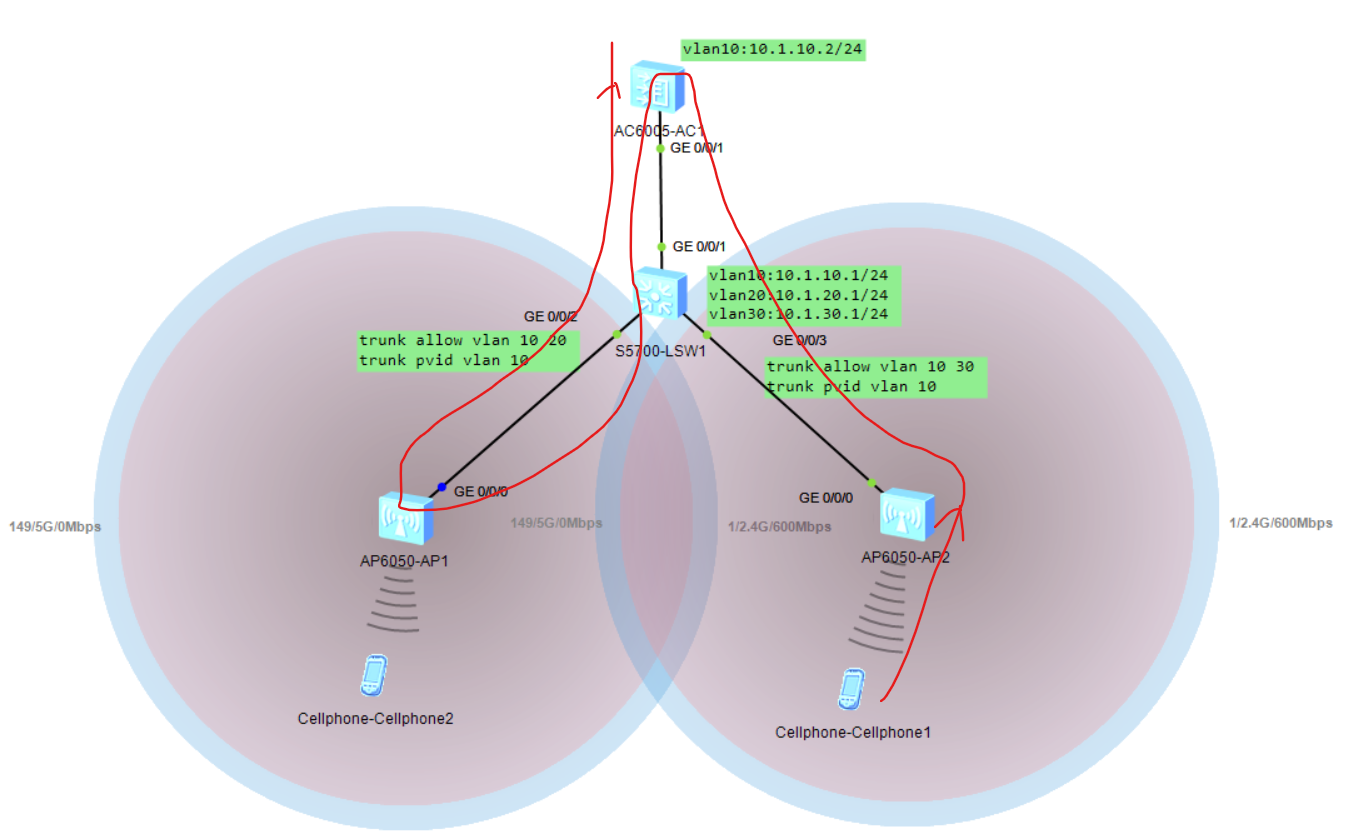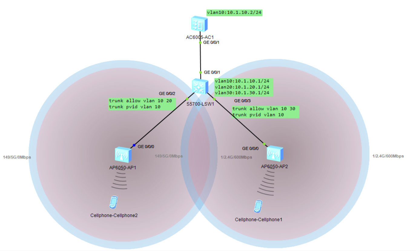 AP1和AP2注册到同一AC上,AP1下业务vlan20,AP2下业务vlan30,属于不同网段。
