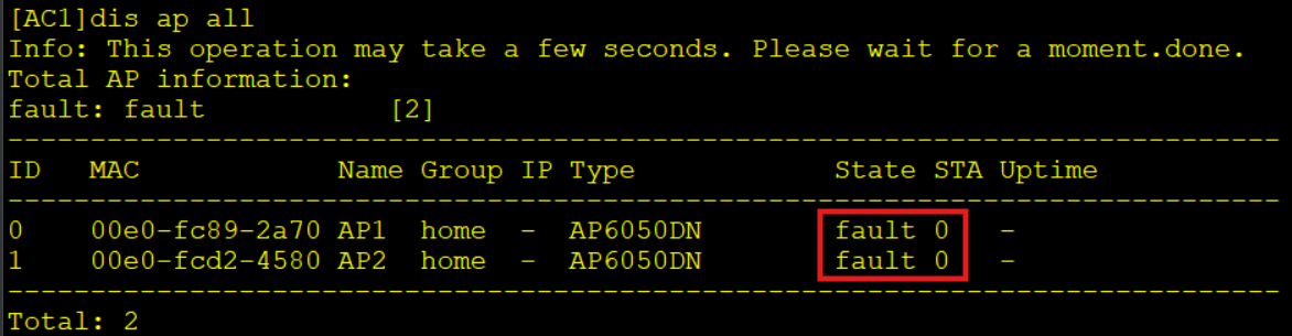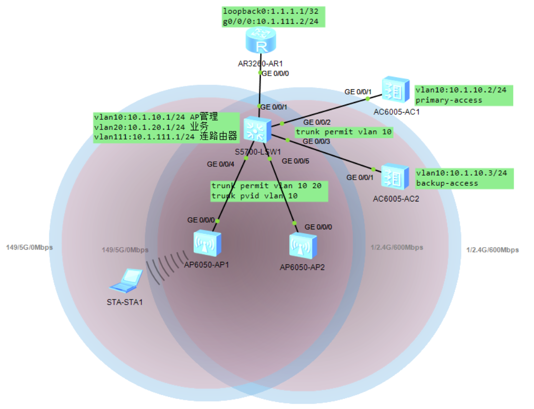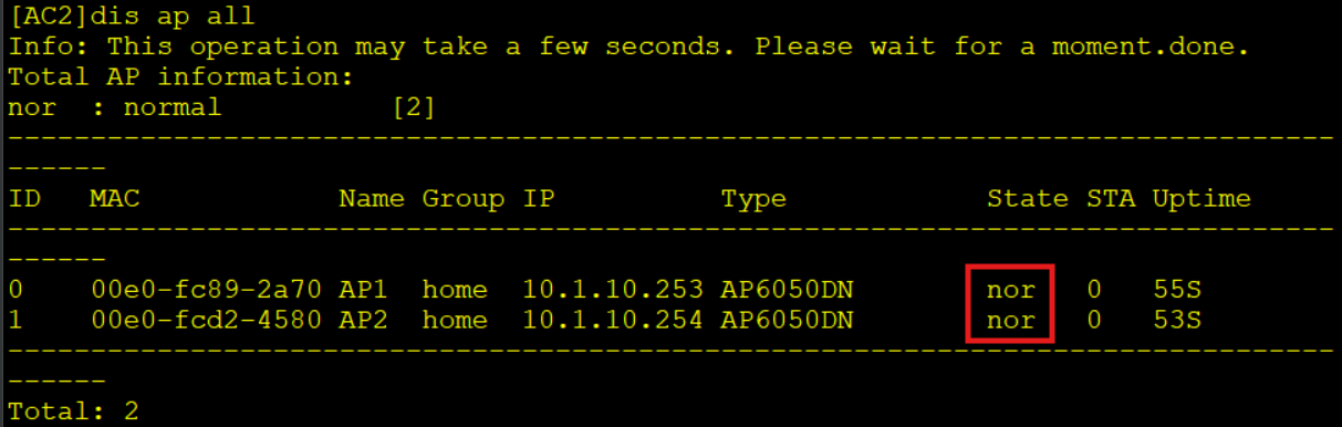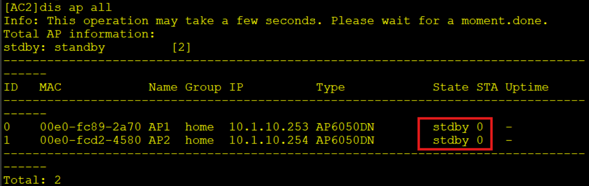 AC1为主用AC,AC2为备用AC。AC1掉线后,AP自动在AP2上线,当AC1恢复后,一段时间后会抢占回主,中间出现业务掉线,终端需要重新连接无线。