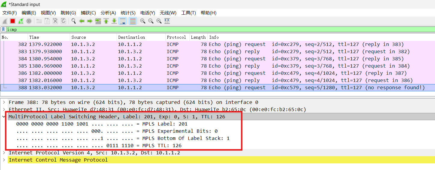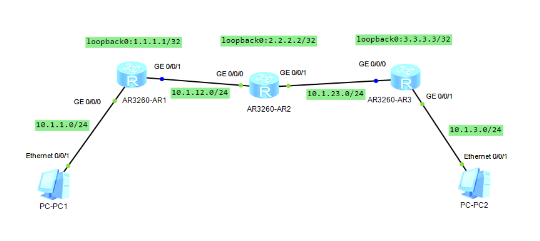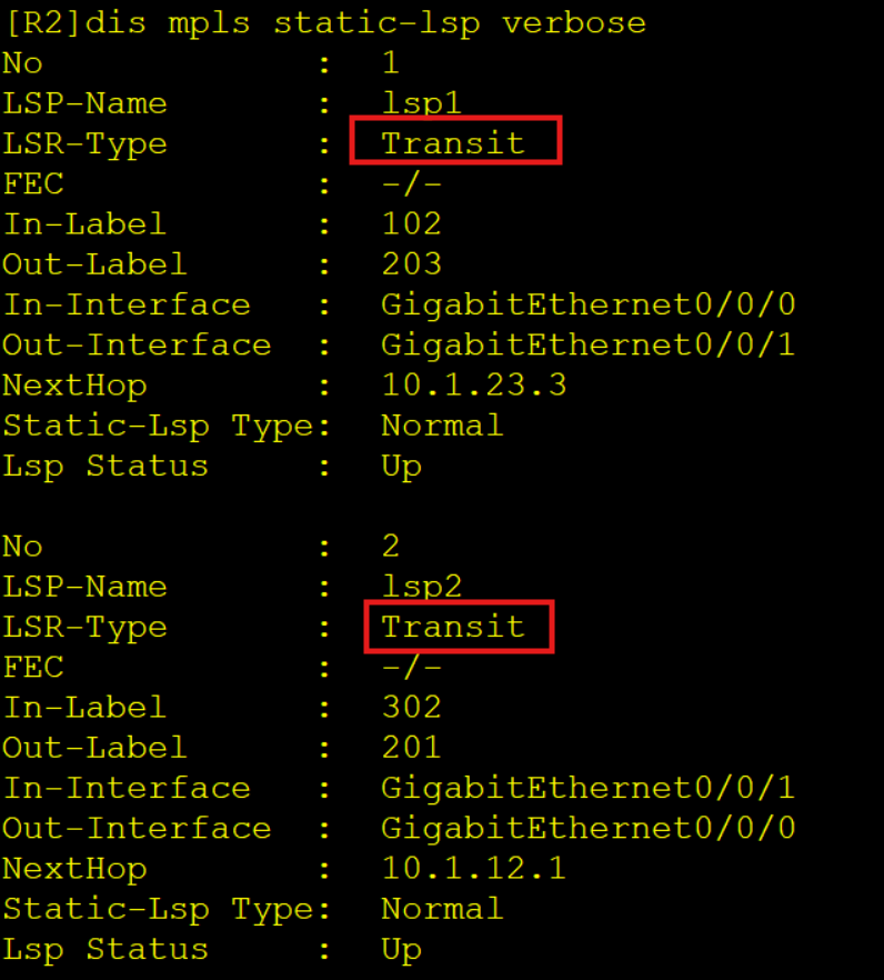 | # mpls lsr-id 1.1.1.1 mpls # interface GigabitEthernet0/0/0 ip address 10.1.1.1 255.255.255.0 mpls # interface GigabitEthernet0/0/1 ip address 10.1.12.1 255.255.255.0 mpls # interface LoopBack0 ip address 1.1.1.1 255.255.255.255 # ospf 1 router-id 1.1.1.1 area 0.0.0.0 network 1.1.1.1 0.0.0.0 network 10.1.1.0 0.0.0.255 network 10.1.12.0 0.0.0.255 # static-lsp ingress lsp1 destination 10.1.3.0 24 outgoing-interface GigabitEthern et0/0/1 nexthop 10.1.12.2 out-label 102 static-lsp egress lsp2 incoming-interface GigabitEthernet0/0/1 in-label 201 # | # mpls lsr-id 2.2.2.2 mpls # interface GigabitEthernet0/0/0 ip address 10.1.12.2 255.255.255.0 mpls # interface GigabitEthernet0/0/1 ip address 10.1.23.2 255.255.255.0 mpls # interface LoopBack0 ip address 2.2.2.2 255.255.255.255 # ospf 1 router-id 2.2.2.2 area 0.0.0.0 network 2.2.2.2 0.0.0.0 network 10.1.12.0 0.0.0.255 network 10.1.23.0 0.0.0.255 # static-lsp transit lsp1 incoming-interface GigabitEthernet0/0/0 in-label 102 nex thop 10.1.23.3 out-label 203 static-lsp transit lsp2 incoming-interface GigabitEthernet0/0/1 in-label 302 nex thop 10.1.12.1 out-label 201 # | # mpls lsr-id 3.3.3.3 mpls # interface GigabitEthernet0/0/0 ip address 10.1.23.3 255.255.255.0 mpls # interface GigabitEthernet0/0/1 ip address 10.1.3.1 255.255.255.0 mpls # interface LoopBack0 ip address 3.3.3.3 255.255.255.255 # ospf 1 router-id 3.3.3.3 area 0.0.0.0 network 3.3.3.3 0.0.0.0 network 10.1.3.0 0.0.0.255 network 10.1.23.0 0.0.0.255 # static-lsp egress lsp1 incoming-interface GigabitEthernet0/0/0 in-label 203 static-lsp ingress ls2 destination 10.1.1.0 24 outgoing-interface GigabitEtherne t0/0/0 nexthop 10.1.23.2 out-label 302 # |