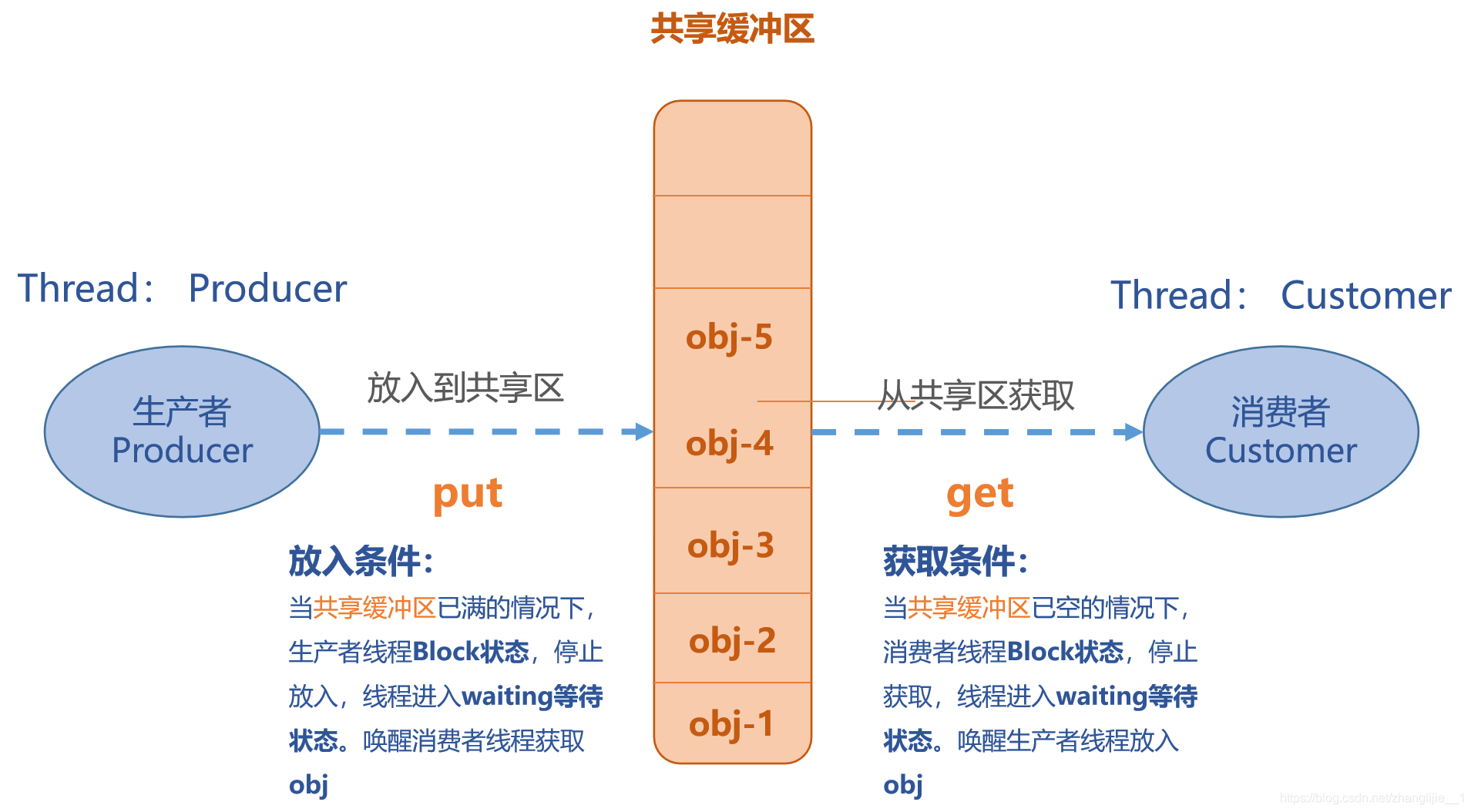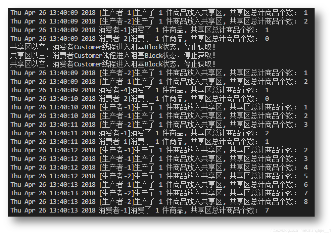 print('共享区已空,消费者Customer线程进入阻塞Block状态,停止获取!')