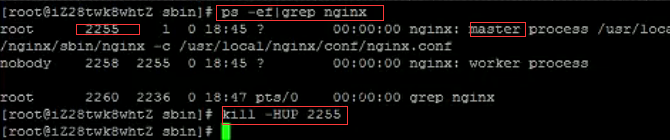 方法二:查找当前nginx进程号,然后输入命令:kill -HUP 进程号 实现重启nginx服务