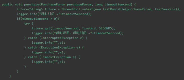 首先我们先不说这段代码的格式如何如何,先看功能实现,使用 Future 来做超时控制,这是为何呢?原因其实是在我们调用的 Dubbo 接口上面,因为是 Dubbo 已经经过二次封装,结果把自带的 timeout 给淹沫了,程序员只能通过这种方式来控制超时,可以看到这种用法非常差劲,对程序性能造成一定的影响。