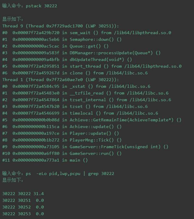 一般我们会通过 top 命令查看各个进程的 cpu 和内存占用情况,获得到了我们的进程 id,然后我们将会通过 pstack 命令查看里边的各个线程 id 以及对应的线程现在正在做什么事情,分析多组数据就可以获得哪些线程里有慢操作影响了服务器的性能,从而得到解决方案。示例如下: