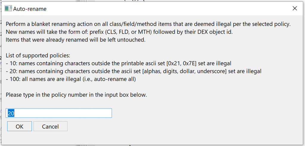 JEB 3.13 introduced a new generic action, Auto-Rename All. Its implementation is at the discretion of code plugins. The DEX plugin implements it, therefore users may execute Action, Auto-Rename All… at any time (generally after processing an obfuscated file) in order to rename code items such as field, method, or class names, to something more easily processable for our -limited- human brains.