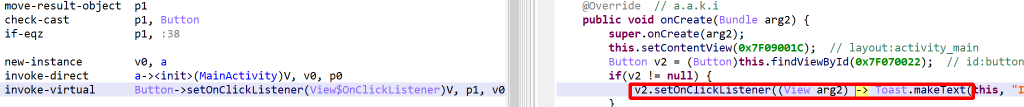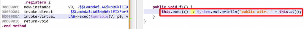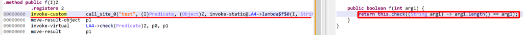 Lambda reconstruction also takes place when the code has not been desugared (which is rare!), i.e. code relying on dex38’s invoke-custom and invoke-polymorphic.