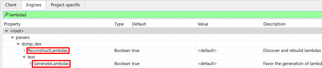 Options: Lambda reconstruction can be disabled in the options (Edit, Options, Engines, …). Lambda rendering can also be disabled in the options, as well as on-demand by right-clicking a decompiled view, Rendering Options….
