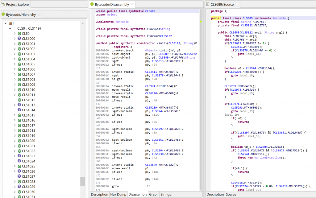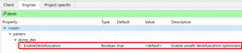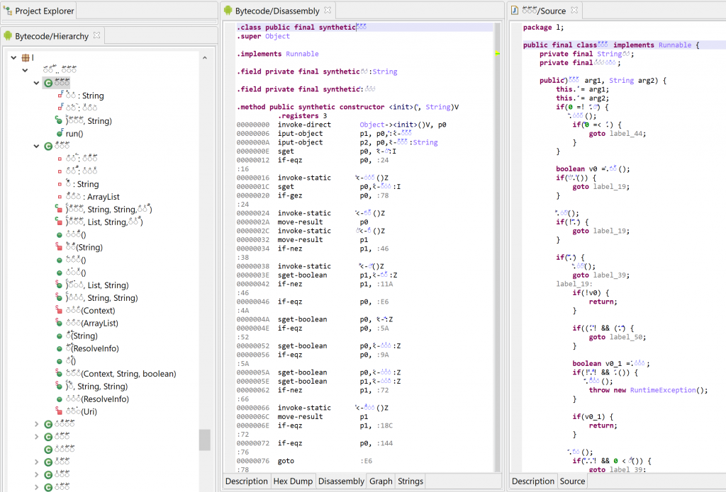 JEB ships with a generic deobfuscator that can perform on-the-fly string decryption and other complex optimizations. Although this optimizer performs safe (i.e., guaranteed) optimizations in most cases, it is unsafe in the general case case and therefore, may be disabled in the options. Refer to the Engines options .parsers.dcmp_dex.EnableDeobfuscators and .parsers.dcmp_dex.EmulationSupport.