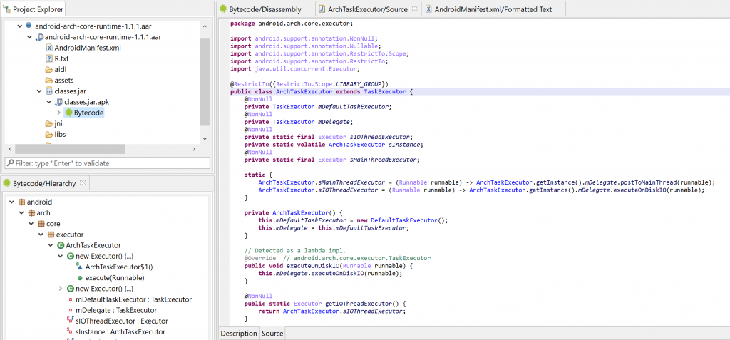 You may use this to decompile Android Library files (*.aar files) in JEB.