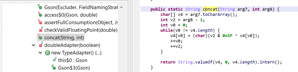 The concat(String, int) method is not part of standard Gson, of course. It was injected by the protector and is used by (some) code to perform on-the-fly string decryption.