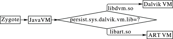 和Dalvik虚拟机一致,ART虚拟机也是由Zygote进程创建的,区别是Dalvik虚拟机在libdvm.so库中实现,而ART虚拟机在libart.so库中实现。Android系统以系统属性persist.sys.dalvik.vm.lib的值来决定运行应用时使用的虚拟机。如果值等于libdvm.so,则在Dalvik虚拟机中运行应用;如果值等于libart.so,则在ART虚拟机中运行应用。