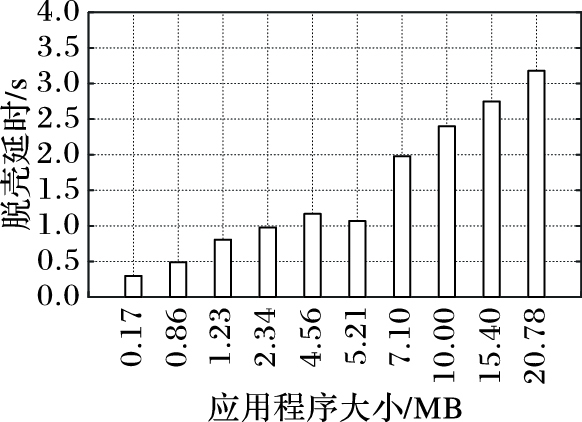 表 3列出了使用的10个测试应用,分别记录下APK的大小(单位为MB)和该APK中包含的DEX文件的大小(单位为MB)。从图 6中可以清楚地看到,在APK大小为5.21 MB时,脱壳延时有小幅度的回落,根据表 3中显示该APK的DEX文件大小为2.4 MB,小于大小为4.56 MB和7.1 MB的APK的DEX文件。所以,根据测试结果可以看出,启动延时和APK的大小无关,而和APK中DEX文件大小有关,DEX文件越大,其包含的代码量也就越大,因此脱壳延时就越大。
