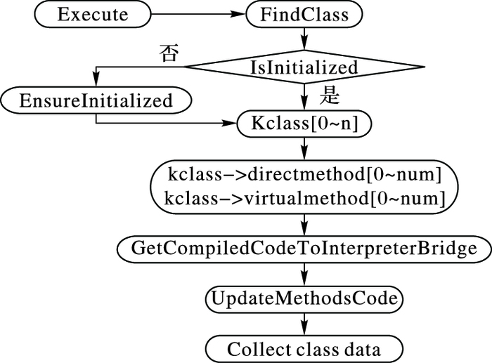 对于加固技术来说,不管是Dalvik还是ART,都选择使用动态加载和反射调用的方式启动应用的DEX文件。这是因为由于Android系统存在碎片化问题,目前还无法做到在保持良好兼容性的同时对本地机器码进行动态修改[3]。也就是说目前的加壳服务对于应用的加固还是选择修改Dalvik字节码,这样加固程序运行时就必然会使用ART的解释器了,因为修改后的字节码要经过解释后才能运行,这就必然会经过Execute函数。综上所述,该系统选用Execute函数作为关键函数,插入脱壳代码。