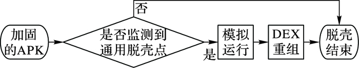 脱壳技术的发展是随着加固技术的发展而发展起来的,其中最通用也最耗时的脱壳方式是人工分析,这种方法在技术发展的早期很有效,其明显缺点是需要分析人员有大量的分析经验。基于HOOK技术的脱壳方法随后出现,通过HOOK技术,脱壳程序可以附加到应用程序的进程中,通过在内存中搜索关键词如dex035、dey036等,定位内存中解密后的DEX文件或者odex文件,直接dump这段内存即可得到应用真正的DEX文件。但是随着加固技术的发展,加固者会将解密出的DEX文件的魔数(magic)值抹除,并且采用只解密恢复正在执行的method的策略[15],在这种情况下直接dump内存的方法便不再通用。最近出现的源码插桩方法可以解决内存dump方法无法解决的问题,该方法通过修改Android源码,定制一个具有脱壳功能的ROM来实现脱壳。这种方式不受任何Anti-debugging的影响,也不会因为在内存中匹配不到关键字而无法脱壳。本文就是在源码插桩技术的基础上结合模拟运行技术,提出了一种通用的自动脱壳方法。
