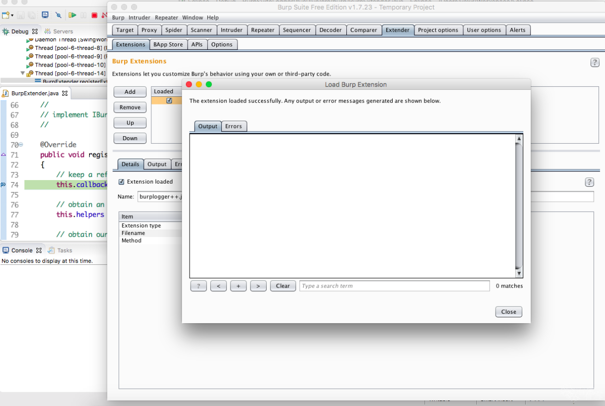 Debug运行工程,可以看到BurpSuite启动过程,继续,然后在BurpSuite中加载插件开始附加调试